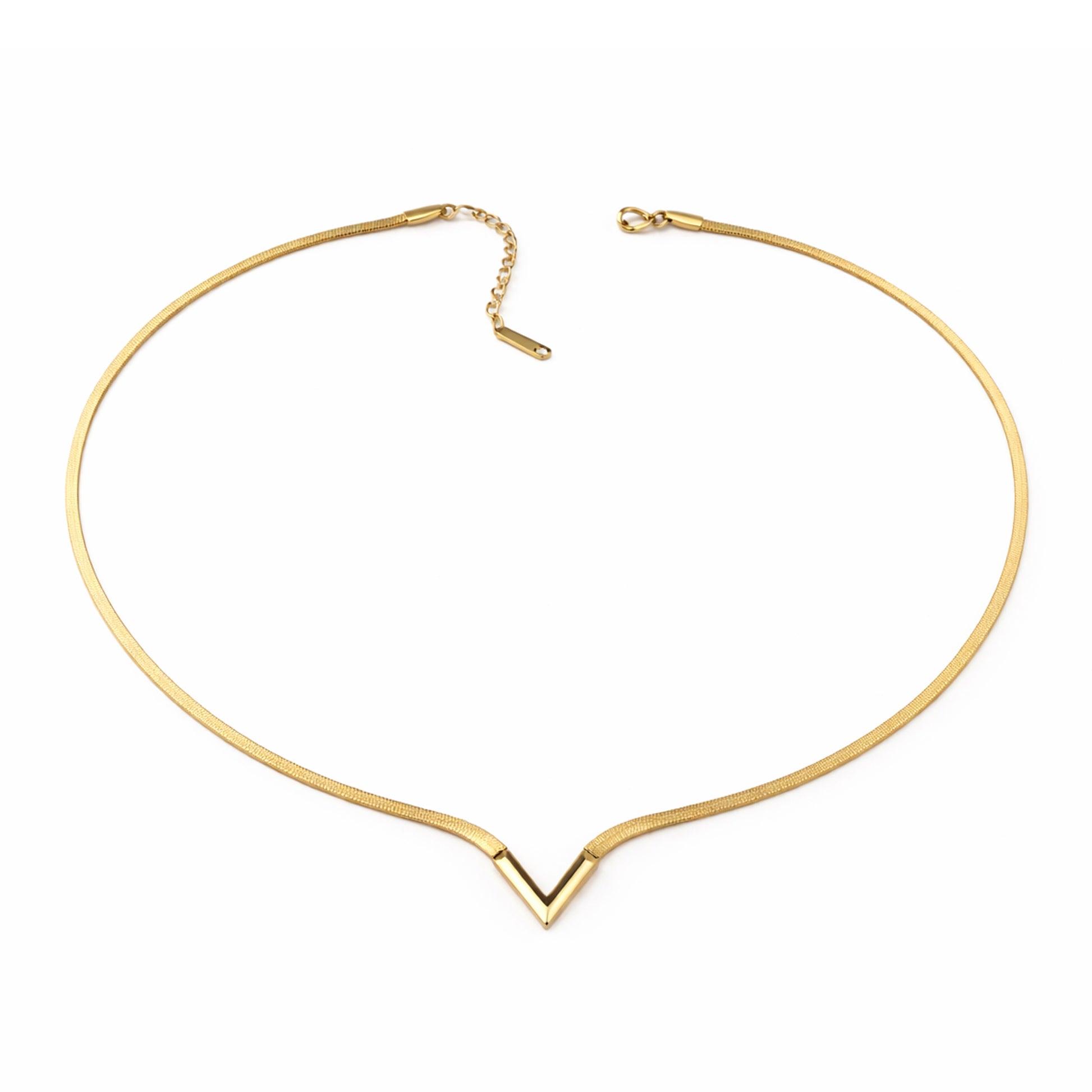 Crafted with a polished gold-tone chain, the Vertex V Necklace blends contemporary design with timeless elegance, making it perfect for both daily wear and special occasions. Its clean geometric silhouette sits beautifully along the neckline, creating a flattering and effortlessly luxurious look.