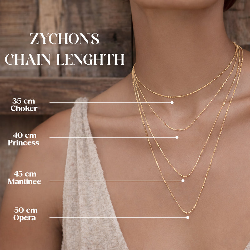 Zychon chains are crafted in refined lengths — from the 35 cm choker that contours the neckline to the 50 cm opera length that drapes with graceful elegance. The 40 cm princess and 45 cm matinee lengths offer a timeless silhouette, designed for effortless layering and elevated minimalist styling.